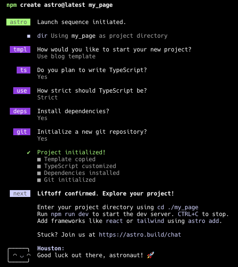 Now, create a repository using the Astro CLI tool, and select the ‘Use blog template’ option to obtain sample templates for sample data integration with CMS later.