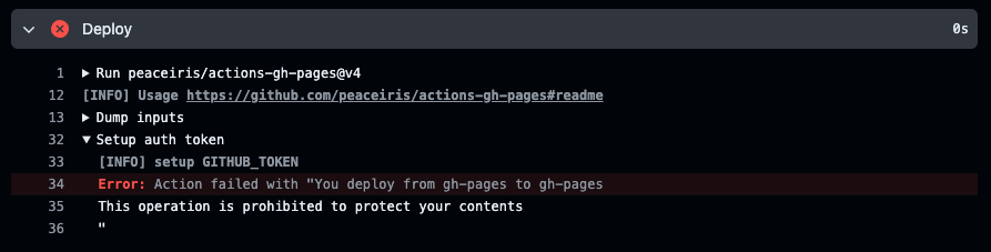 I initially thought there was an issue with the github_token section, as the official documentation mentioned setting up some things for the first deployment. Therefore, I thought I needed to first push to GitHub from the gh-pages branch to establish permissions.