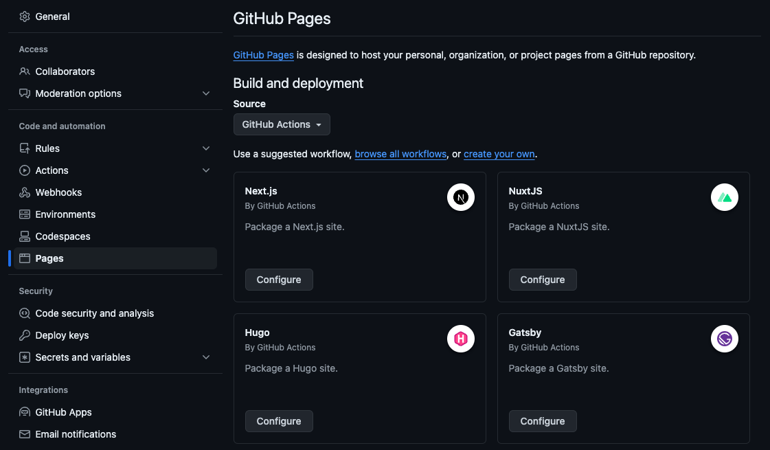 Go to the Settings page of the Github project and select Pages to see the Github Pages deployment settings. Github Pages currently offers two automated deployment methods.