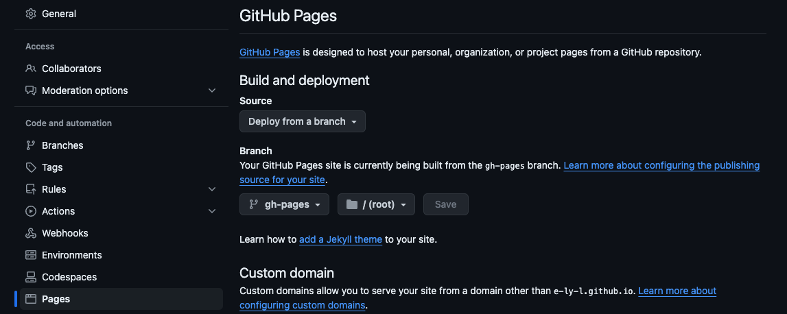 Next, I started thinking about where to deploy it. As a beginner, I wanted a platform that is (at least initially) free and preferably automates the deployment process as much as possible. After some research, I found that Github Pages fits my initial needs well. Since I’m building a technical blog, it makes sense to host it together with my Github projects.